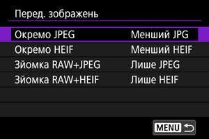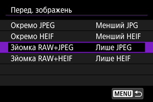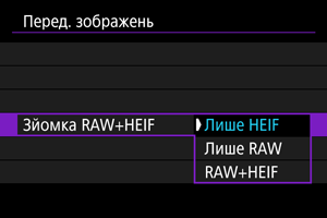 - Виберіть [Зйомка RAW+HEIF], потім виберіть [Лише HEIF], [Лише RAW] або [RAW+HEIF].