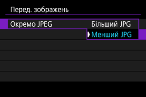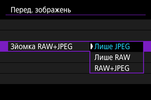 - Виберіть [Перенес. RAW+JPEG], потім виберіть [Лише JPEG], [Лише RAW] або [RAW+JPEG].