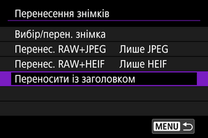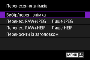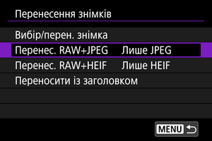 Для зображень у форматі RAW+JPEG або RAW+HEIF можна вказати зображення для перенесення.