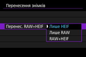 - Виберіть [Перенес. RAW+HEIF], потім виберіть [Лише HEIF], [Лише RAW] або [RAW+HEIF].