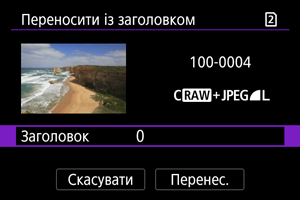 - На екрані [Переносити із заголовком] не можна вибрати інші зображення. Щоб вибрати інше зображення для передавання із заголовком, перегляньте це зображення, а потім дотримуйтеся цих інструкцій.