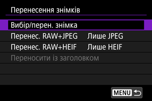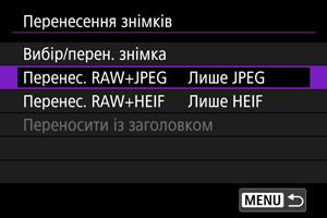 Для зображень у форматі RAW+JPEG або RAW+HEIF можна вказати зображення для перенесення.