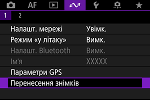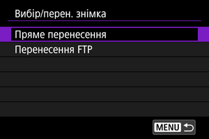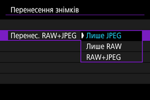 - Виберіть [Перенес. RAW+JPEG], потім виберіть [Лише JPEG], [Лише RAW] або [RAW+JPEG].