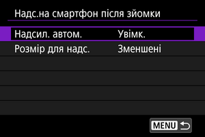 Вибір пункту [Надс.на смартфон після зйомки] у розділі [Налаштування смартфона] дає змогу встановити розмір зображень, які надсилатимуться автоматично.