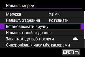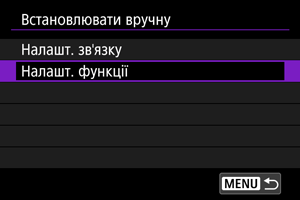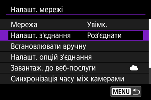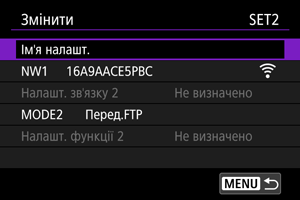 Можна перевірити, змінити або видалити параметри зв’язку та функцій, збережені на камері. Можна також налаштувати параметри, не встановлені за допомогою майстра підключення, наприклад параметр, який визначає дію в разі передавання на FTP-сервер файлу з тим самим ім’ям, що й у наявних файлів.