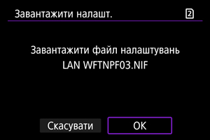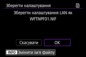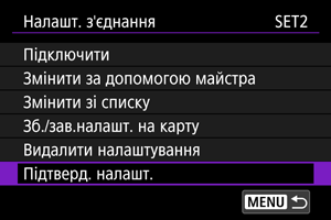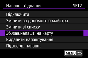 Параметри підключення можна зберегти на карту для використання з іншими камерами. Параметри підключення, що налаштовані на інших камерах, можна також застосувати на камері, якою будете користуватися.