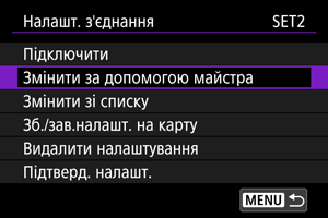 Змінити параметри підключення, збережені на камері, можна за допомогою майстра підключення.
