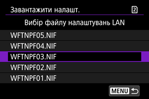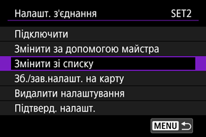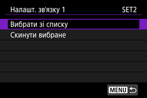 Якщо вибрати пункт [Вибрати зі списку], буде відображено список параметрів зв’язку, що збережені на камері. Виберіть параметри зв’язку для використання.