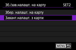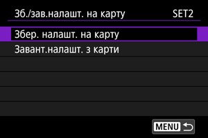 : Зб./зав.налашт.кам. на карту] дає змогу зберегти всі параметри зв’язку камери на карту або завантажити з карти всі параметри зв’язку на іншу камеру.