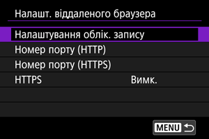 Якщо вибрати пункт [Налашт. віддаленого браузера], це дасть змогу налаштувати обліковий запис для використання в програмі Browser Remote та настроїти параметри зв’язку по протоколу HTTP/HTTPS.