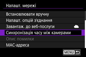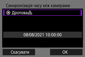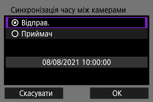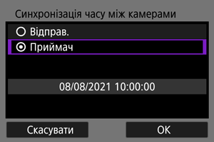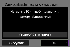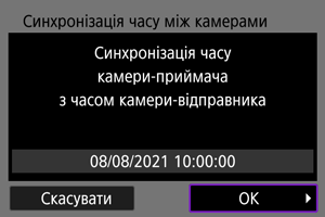 Значення часу камери-відправника можна встановити щонайбільше на 10 камерах-приймачах. Зверніть увагу, що навіть після синхронізації між значенням часу камери-відправника та камери-приймача залишатиметься невелика межа похибки (макс. ±0,05 с).