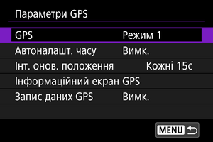 У камері можна налаштувати отримання даних часу, що надходять із сигналами GPS. Межа похибки становить приблизно ±0,02 с. Якщо вибрати параметр [Автооновл.], значення часу оновлюватиметься за надходження сигналів GPS, коли камера ввімкнута.