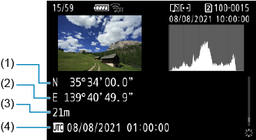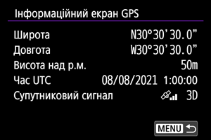 Дані геотегування можна перевірити. Для цього виведіть на екран знімок, натисніть кнопку . Після того як відобразиться екран відтворення з детальною інформацією, натисніть