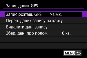 вимикає функцію запису даних GPS. Однак функція запису даних GPS продовжує працювати під час автоматичного вимкнення живлення.