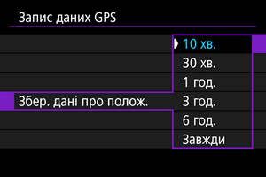 Можна вставити інтервал (час) позиціонування для оновлення даних геотегування. Якщо дані геотегування оновлюються за коротші інтервали часу, вони будуть точнішими, хоча це зменшить кількість можливих знімків, оскільки акумулятор розряджатиметься швидше.