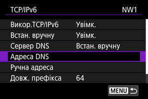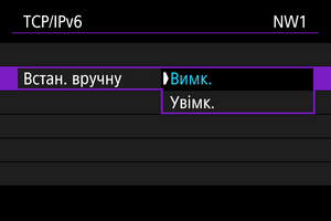 - Щоб призначити IP-адресу вручну, виберіть пункт [Увімк.]. Для параметра [Сервер DNS] установлено значення [Встан. вручну], отже можна настроїти параметри [Адреса DNS], [Ручна адреса], [Довж. префікса] та [Шлюз].