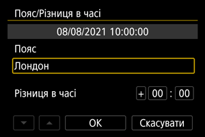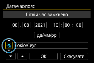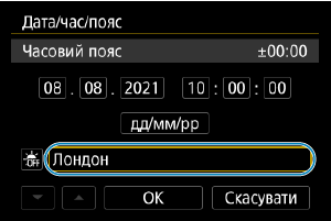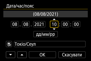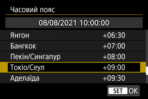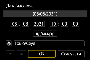 Під час першого вмикання камери, а також у разі скидання параметрів дати/часу/часового поясу виконайте наведені нижче дії, щоб уперше задати часовий пояс.