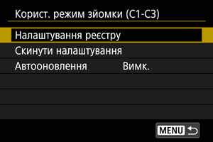 - Залежно від пунктів меню, значення параметрів, які було змінено в інших режимах зйомки, може бути не перенесено до параметрів користувацького режиму зйомки.