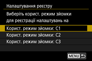 - Виберіть користувацький режим зйомки, який потрібно зареєструвати, потім натисніть [OK] на екрані [Налаштування реєстру].