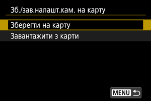 Поточні налаштування камери, як-от параметри зйомки, меню та користувацьких функцій, можна зберегти на карті як файл налаштувань камери. Завантажуючи файл налаштувань камери, можна застосувати стан налаштувань як збережених. Це дає змогу зберегти та застосувати оптимальні налаштування для певних умов зйомки або завантажити файли налаштувань на інші камери EOS R3, щоб використовувати ці камери з тими самими налаштуваннями.