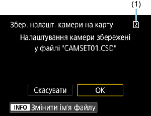 - На карті можна зберегти до десяти файлів налаштувань камери. Якщо карта вже містить десять файлів налаштувань камери, перезапишіть наявні файли або скористайтесь іншою картою.