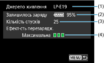 - (3) Кількість знімків, зроблених із поточним акумулятором. Це значення скидається, коли акумулятор перезаряджається.