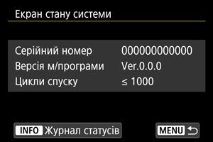На цьому екрані можна перевірити серійний номер камери, версію мікропрограми та цикли спуску затвора. Крім того, у журналі стану можна переглянути минулі помилки.