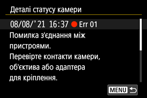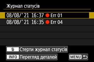 - На екрані журналу стану камери відображаються п’ять останніх записів про помилки. Старіші записи видаляються автоматично.