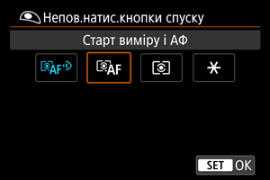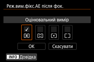 Для кожного режиму виміру можна вказати, чи потрібно фіксувати експозицію після фокусування на об'єктах зйомки при покадровому автофокусуванні. Експозиція залишається зафіксованою, доки кнопка затвора утримується наполовину натиснутою. Виберіть режими виміру для фіксації AE та додайте позначку []. Виберіть [OK], щоб зареєструвати параметр.