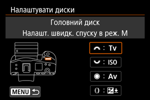 : Режим затвору] вибрано значення [Електронний], а для [Та ж витримка д/нов. діафр.] — значення [Витримка] або [Чутливість ISO/витримка].