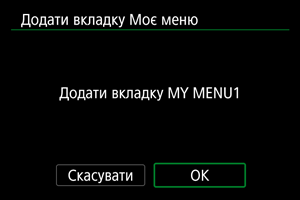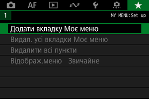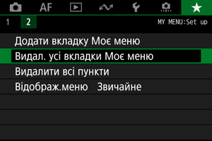 Можна видалити всі створені вами вкладки «Моє меню». Якщо вибрати [Видал. усі вкладки Моє меню], усі вкладки від [MY MENU1] до [MY MENU5] буде видалено та відновлено налаштування вкладки [] за замовчуванням.