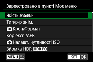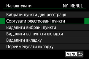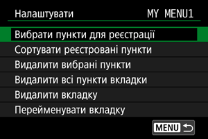 Усі пункти, зареєстровані на вкладках від [MY MENU1] до [MY MENU5], можна видалити. Самі вкладки залишаться. Якщо вибрати [Видалити всі пункти], усі пункти, зареєстровані на створених вкладках, буде видалено.