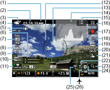 - Електронний рівень, лінії сітки та гістограма не відображаються під час відеозапису (і якщо вони наразі відображаються, під час записування відео зображення на дисплеї зникне).