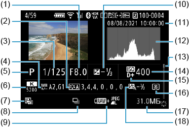- Для зручності були пропущені пояснення щодо елементів, які також включені до розділів Відображення основної інформації для фотографій і Відображення докладної інформації для фотографій і тут не показані