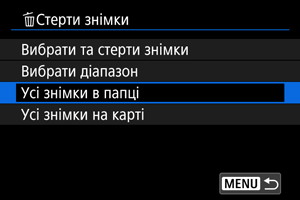 : Стерти знімки], усі зображення в папці або на карті пам’яті буде видалено.