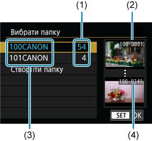 - Папка може містити до 9999 зображень (номери файлів від 0001 до 9999). Коли папка заповнюється, автоматично створюється нова з порядковим номером, більшим на один. Крім того, у разі виконання скидання вручну () нова папка створюється автоматично. Можна створювати папки з номерами від 100 до 999.