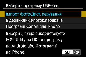 Виберіть, якщо ви будете використовувати службову програму EOS Utility після підключення до комп’ютера або використовувати спеціальні програми Android або версію Фотографій для iOS.
