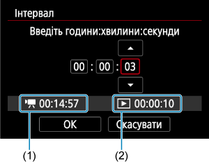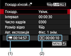 Позначає тривалість запису (час, потрібний для відтворення) покадрової зйомки відео з якістю 4K або Full HD з фотографій, зроблених із заданими інтервалами.