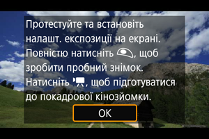 - Як і під час зйомки фотографій, установіть експозицію та налаштуйте функції зйомки, а потім натисніть кнопку затвора наполовину, щоб сфокусувати об’єктив.
