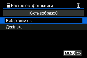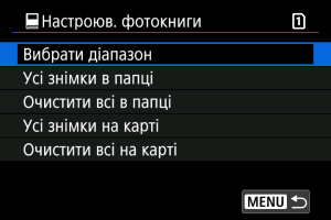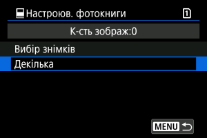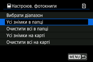 Якщо вибрати значення [Усі знімки в папці] або [Усі знімки на карті] в пункті [Декілька] меню [: Настроюв. фотокниги], для фотокниги буде вибрано всі зображення з папки або карти пам’яті.