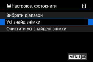 [Усі знайд.знімки]: для фотокниги буде вибрано всі знімки, відфільтровані за умовами пошуку.