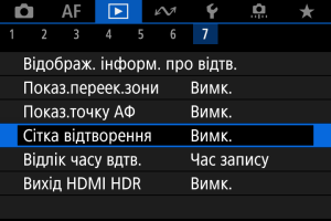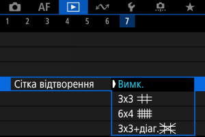 На екрані під час відтворення зображень поодинці на фотографіях можна відобразити сітку. Ця функція стане в пригоді, коли потрібно перевірити композиції та нахил зображення за вертикаллю або горизонталлю.