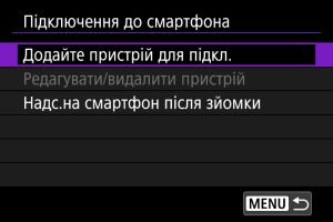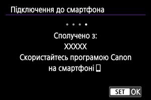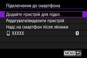 - Через Bluetooth камеру неможливо підключити до двох або більше пристроїв одночасно. Про зміну підключення до іншого смартфона через Bluetooth див. Повторне з’єднання через Wi-Fi/Bluetooth.