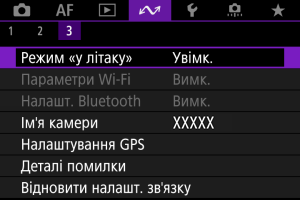 Якщо ви не хочете, щоб вимкнена камера залишалася підключеною через Wi-Fi або Bluetooth, установіть для параметра [: Режим «у літаку»] значення [Увімк.] або для параметра [