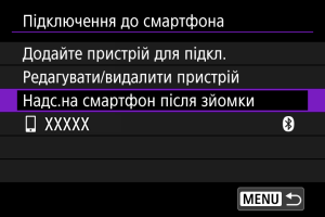Знімки можна надсилати на смартфон автоматично. Перед виконанням наведених нижче кроків переконайтеся, що камера та смартфон з’єднані через Wi-Fi.