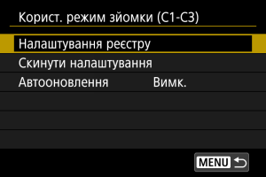 У разі зміни параметрів під час зйомки в користувацькому режимі його можна автоматично оновити з урахуванням змінених параметрів (автоматичне оновлення). Щоб увімкнути таке автоматичне оновлення, на кроці 2 встановіть для пункту [Автооновлення] значення [Увімк.].