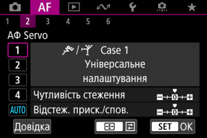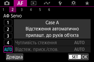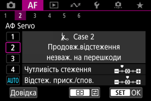 Проте краще натомість вибрати значення [Case 2]–[Case 4], якщо через точки АФ рухаються сторонні об’єкти, об’єкти зйомки важко впіймати або вони несподівано з’являються чи змінюють швидкість.