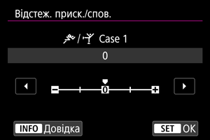 Камера намагатиметься утримувати об’єкт зйомки у фокусі, навіть коли повз точки АФ рухаються сторонні об’єкти або об’єкт зйомки виходить із зони точок АФ. У разі встановлення значення –2 камера продовжить відстежувати об’єкт зйомки довше, ніж за умови встановлення значення –1.