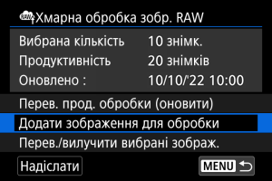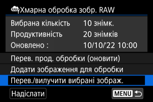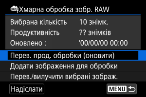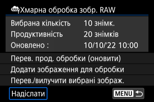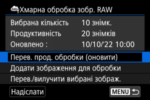 - [Продуктивність] дорівнює [0], якщо у вас немає платної підписки на хмарну обробку зображень RAW. Ви отримаєте інформацію про підписку на адресу електронної пошти, записану на image.canon, якщо ви перевіряєте можливість обробки, не маючи підписки.