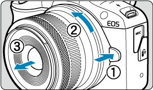 Натиснувши кнопку від’єднання об’єктива, проверніть об’єктив у напрямку, указаному стрілкою.
